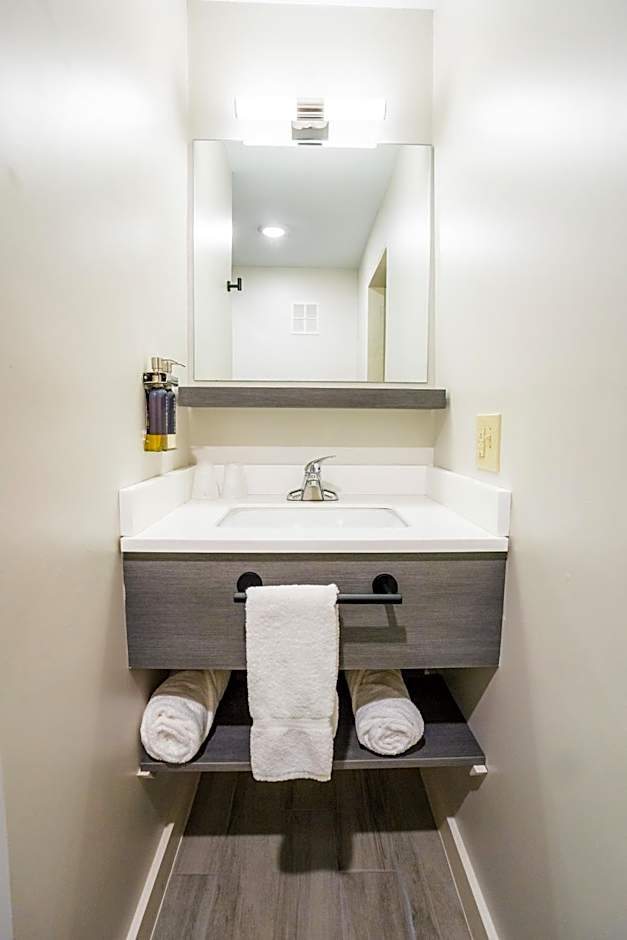 Features include alarm lights, a lowered peep hole and a private bathroom with grab bars and a roll-in shower.